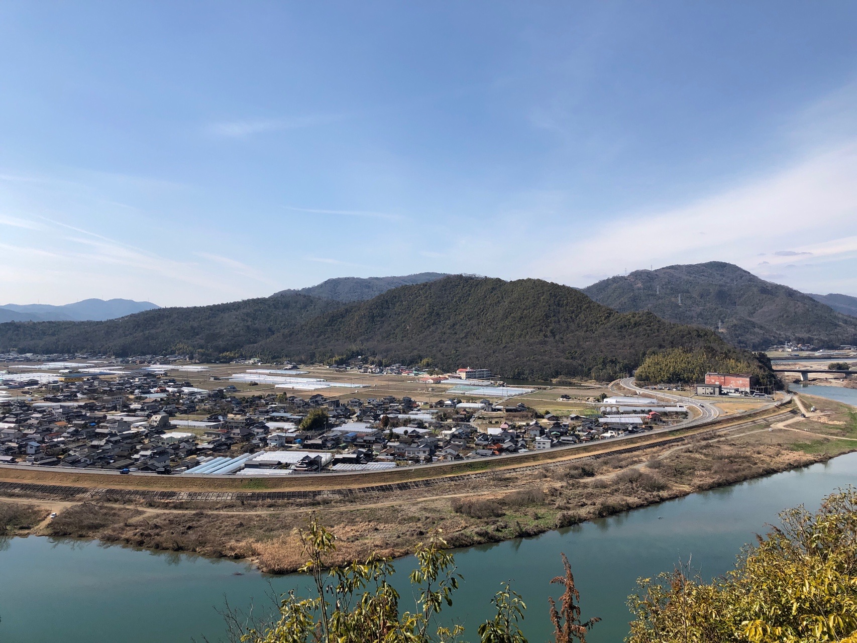この磨崖仏がある山塊は、鳥ヶ岳城跡のあった石田山と峰続きで、城の見張り台だったともいわれています。山陽道を攻めてくる敵の数を確認するために道を曲げた「大曲」(約3キロ東)を見通すことができます。