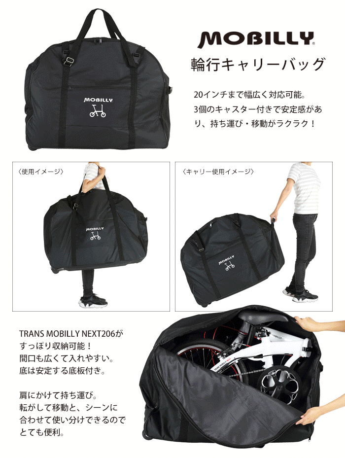 専用の輪行袋は間口も広く車体を収納しやすく、底面の片側にはキャスター付き・底面は底板が付いており安定して持ち運びできます。